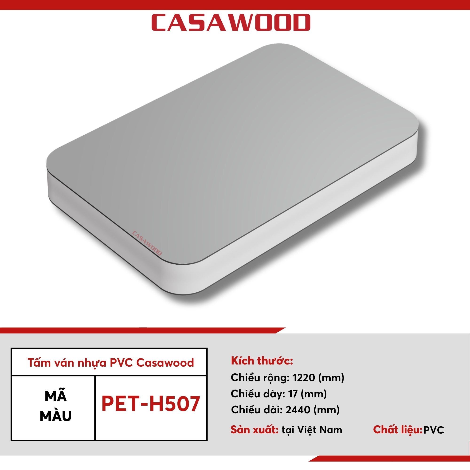 Tấm ván nhựa PVC Casawood màu PET-H507 là dòng tấm nhựa nội thất cao cấp thế hệ mới được phát triển bởi Đại Việt Group, mang tiêu chuẩn độ dày 17 mm và được sản xuất trên dây chuyền công nghệ tiên tiến. Cấu trúc lõi dày giúp tấm đạt được độ bền cơ lý cao, khả năng chịu lực vượt trội và đảm bảo tính ổn định lâu dài trong quá trình sử dụng.